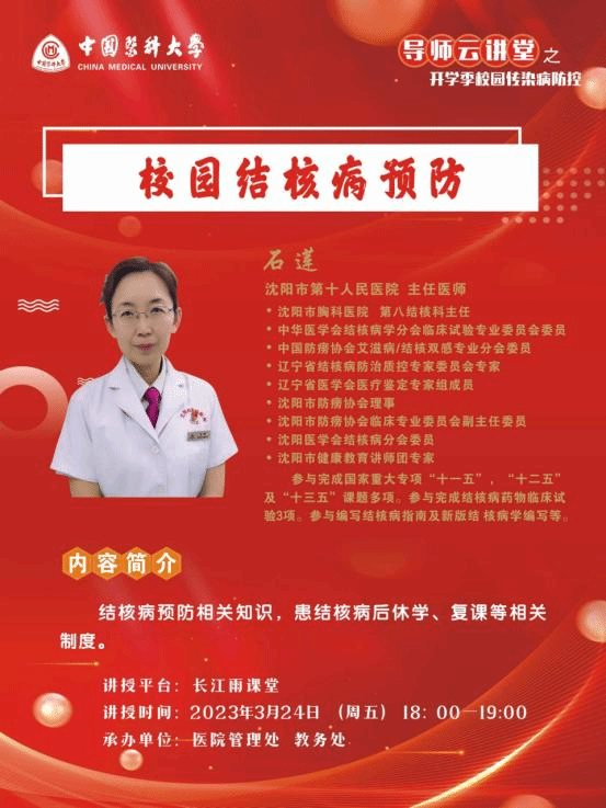 为认真扎实传染病健康教育工作,向全校师生普及结核病防治相关知识,中国医科大学“导师云讲堂”之“校园结核病预防”专题活动即将举行,现将具体安排通知如下: