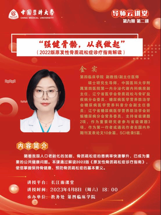 中国医科大学导师云讲堂第九期第一、二讲活动由教务处联合第四临床学院举行。现将活动安排通知如下:
