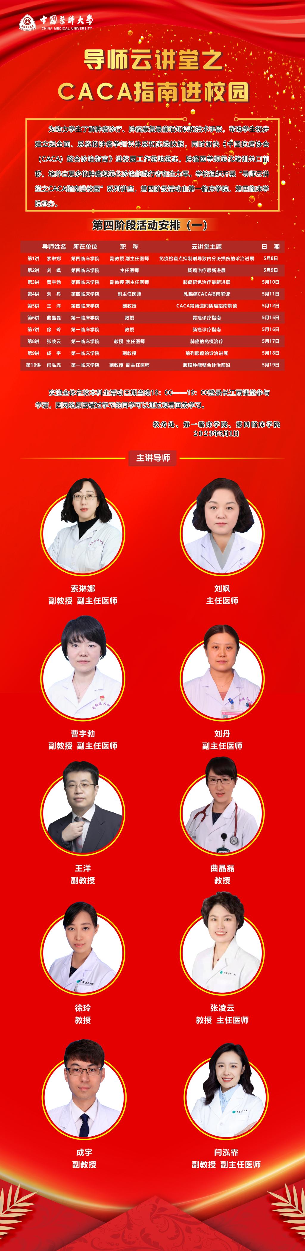 为助力学生了解肿瘤诊疗、肿瘤康复最前沿知识和技术手段,帮助学生初步建立起全面、系统的肿瘤学知识体系和实践技能,同时加快《中国抗癌协会(CACA)整合诊治指南》进校园工作落地落实,肿瘤医学规范化培训关口前移,培养出更多的肿瘤规范化诊治的践行者和生力军。学校组织开展“导师云讲堂之CACA指南进校园”系列讲座,第四阶段活动由第一临床学院、第四临床学院承办。