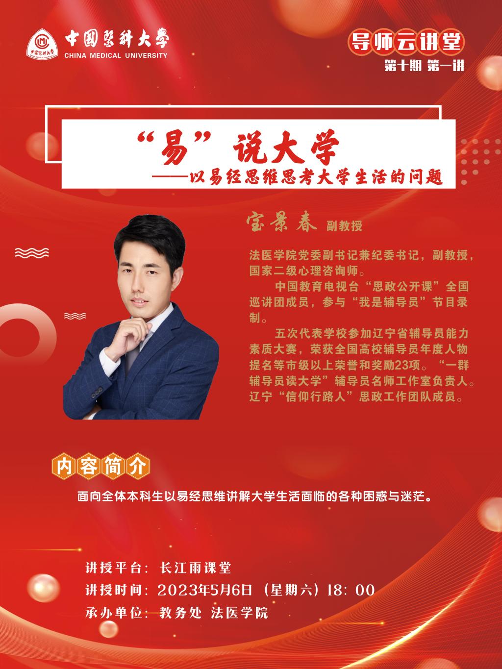 1.主讲题目:《“易”说大学——以易经思维思考大学生活的问题》