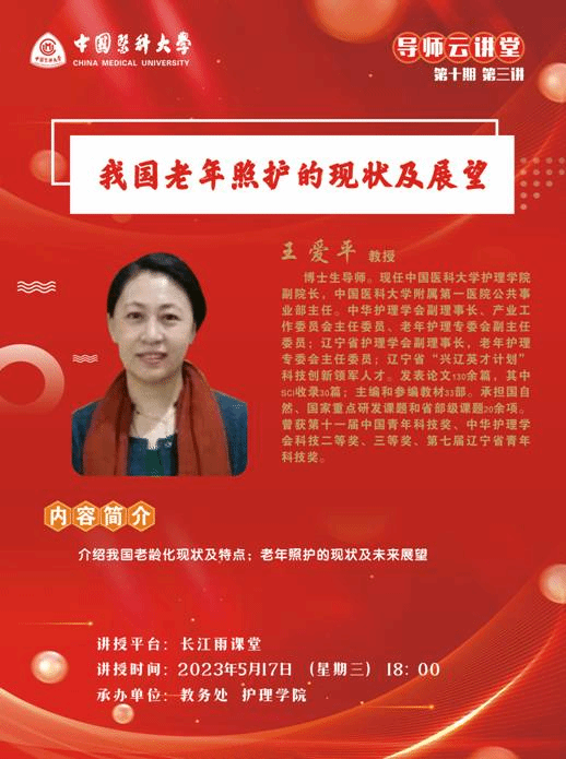 中国医科大学导师云讲堂第十期第三讲活动由教务处联合护理学院举行。现将活动安排通知如下: