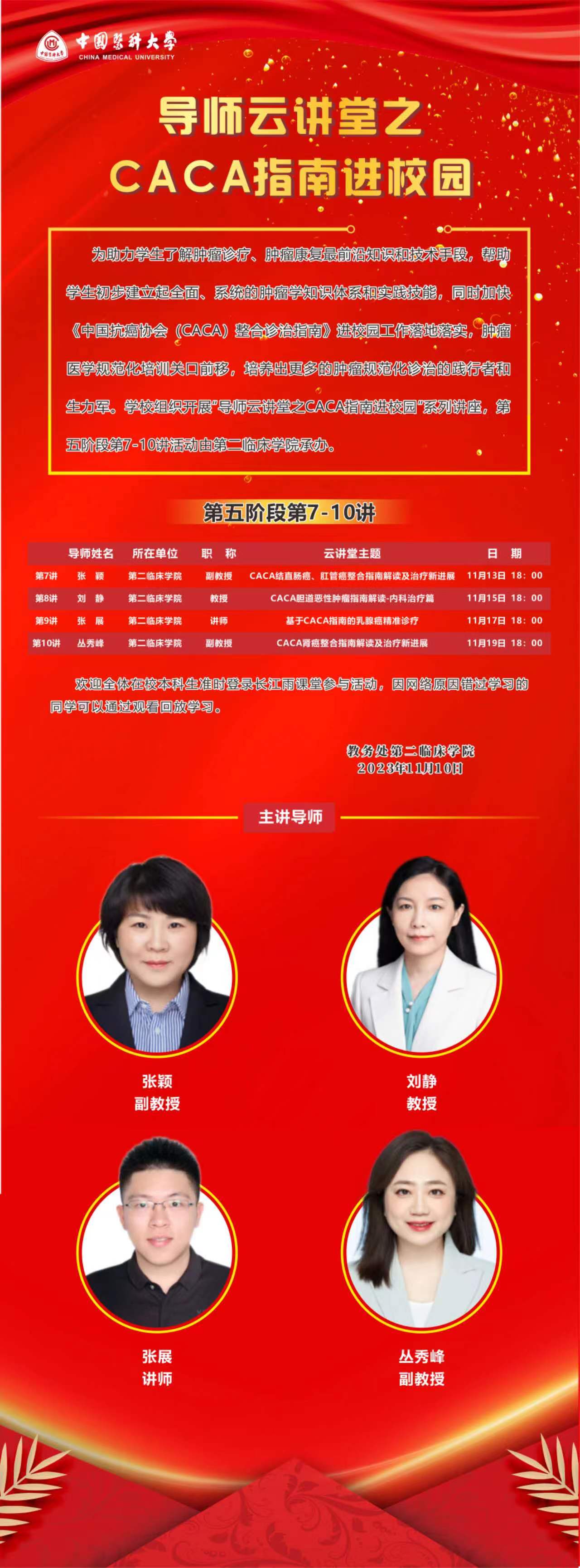 为助力学生了解肿瘤诊疗、肿瘤康复最前沿知识和技术手段,帮助学生初步建立起全面、系统的肿瘤学知识体系和实践技能,同时加快《中国抗癌协会(CACA)整合诊治指南》进校园工作落地落实,肿瘤医学规范化培训关口前移,培养出更多的肿瘤规范化诊治的践行者和生力军。学校组织开展“导师云讲堂之CACA指南进校园”系列讲座,第五阶段第7-10讲活动由第二临床学院承办。
