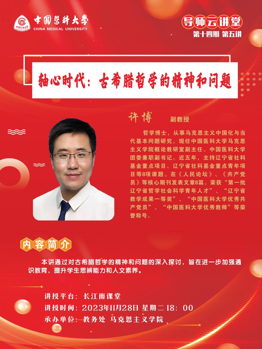 中国医科大学导师云讲堂第十四期第五讲活动由教务处联合马克思主义学院举行。现将活动安排通知如下: