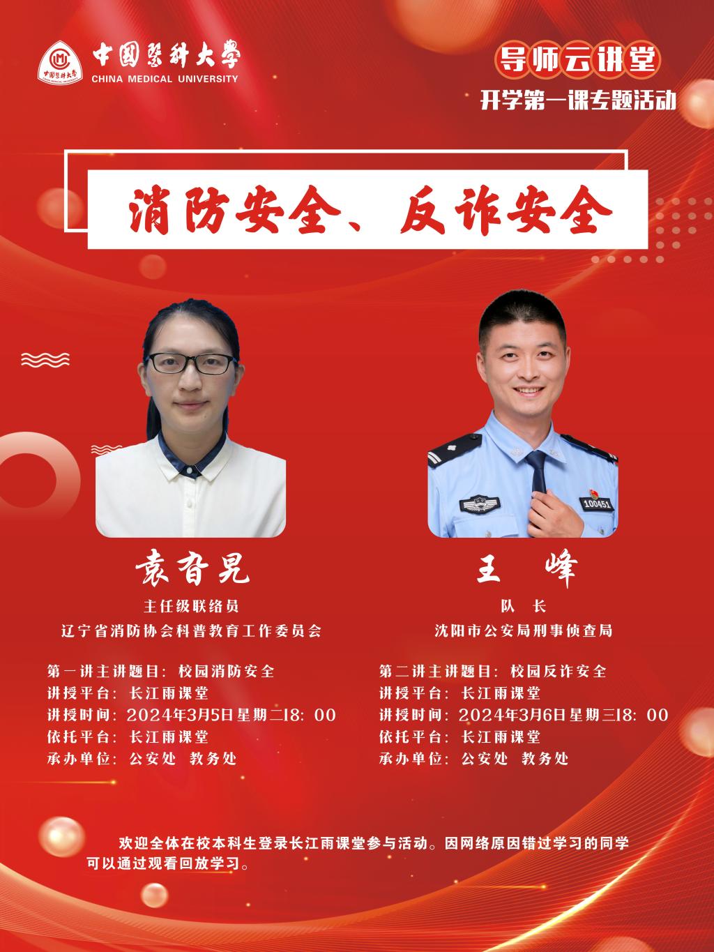 为贯彻落实全校安全生产工作会议精神,增强学生消防安全及反诈安全意识。中国医科大学“导师云讲堂”之“开学第一课”消防安全、反诈安全的专题活动即将举行,现将具体安排通知如下:
