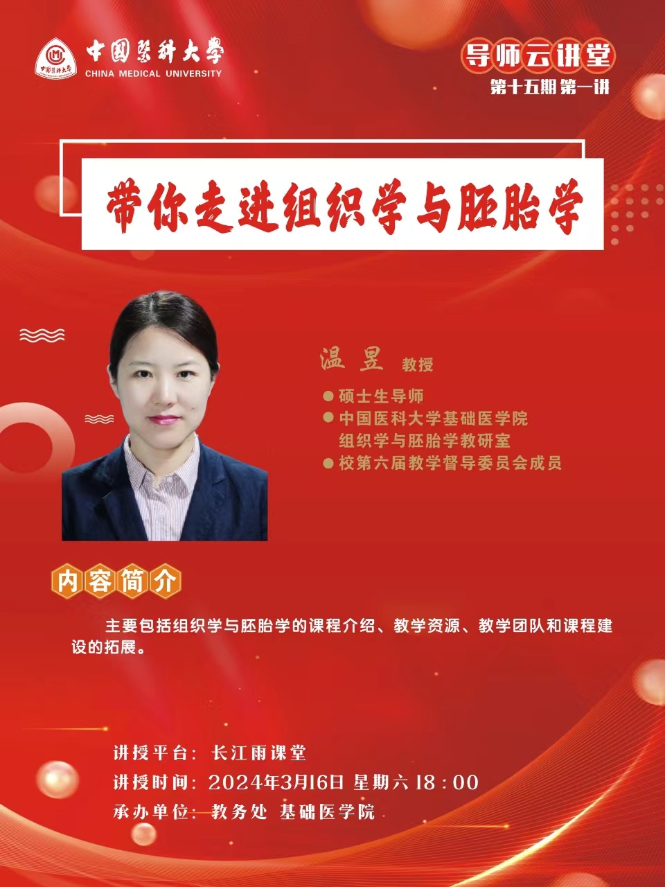 中国医科大学导师云讲堂第十五期第一讲活动由教务处联合基础医学院举行。现将活动安排通知如下: