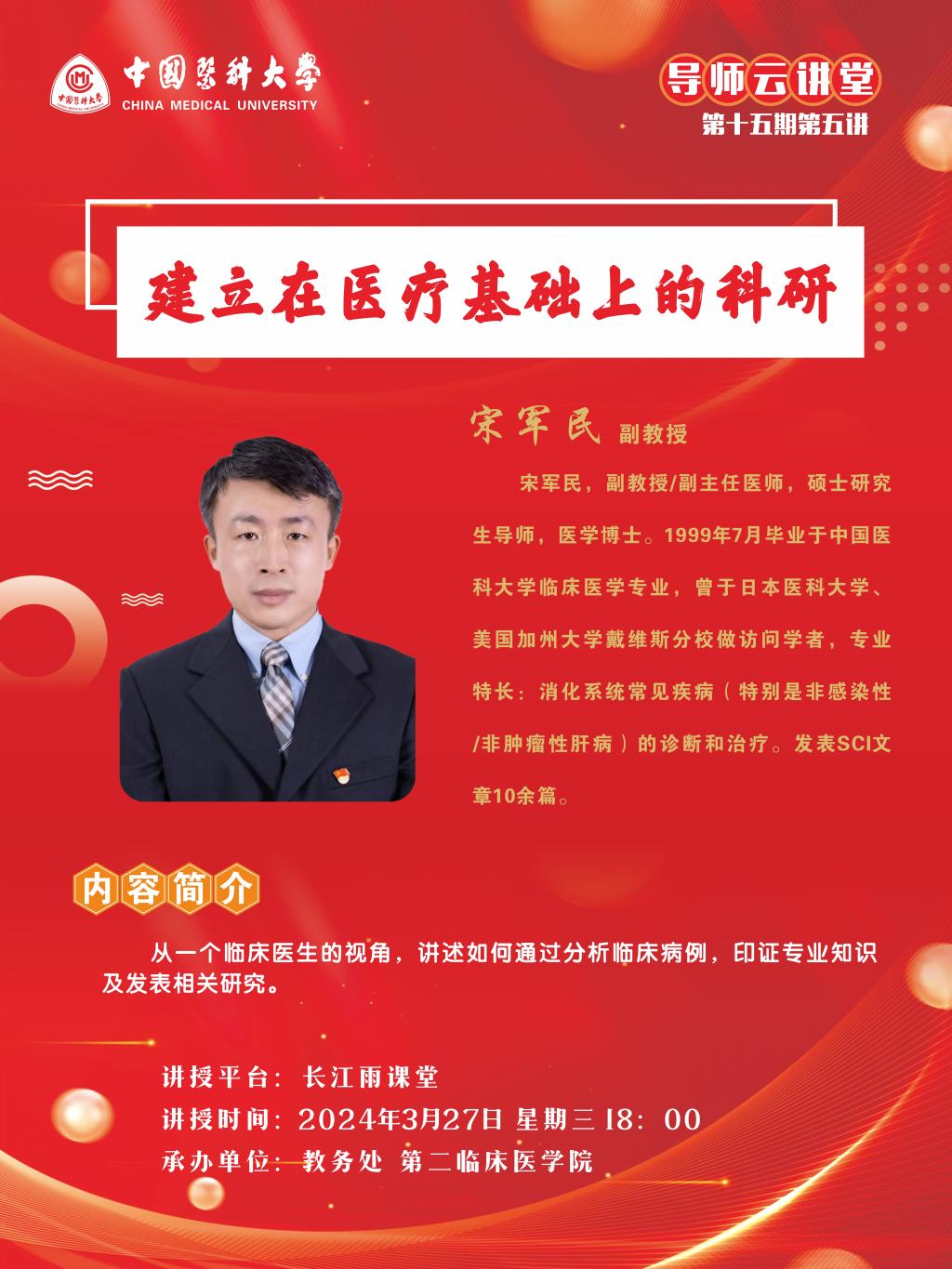 中国医科大学导师云讲堂第十五期第五讲活动由教务处联合第二临床医学院举行。现将活动安排通知如下: