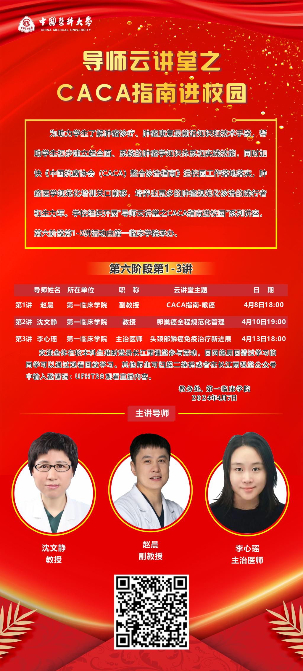 为助力学生了解肿瘤诊疗、肿瘤康复最前沿知识和技术手段,帮助学生初步建立起全面、系统的肿瘤学知识体系和实践技能,同时加快《中国抗癌协会(CACA)整合诊治指南》进校园工作落地落实,肿瘤医学规范化培训关口前移,培养出更多的肿瘤规范化诊治的践行者和生力军。学校组织开展“导师云讲堂之CACA指南进校园”系列讲座,第六阶段第1-3讲活动由第一临床学院承办。