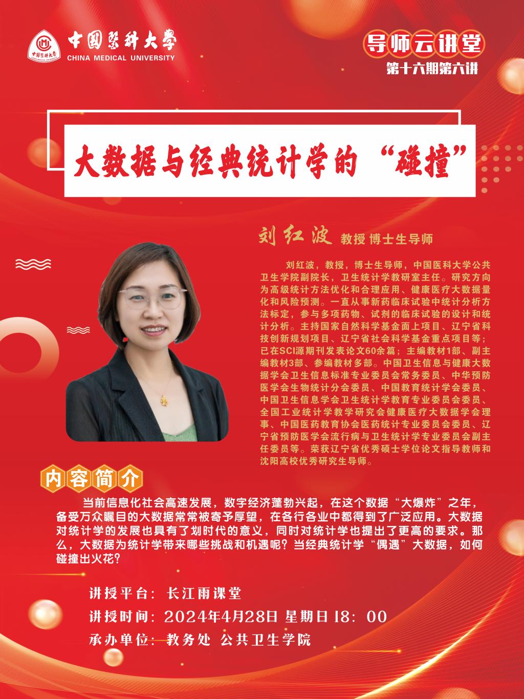 中国医科大学导师云讲堂第十六期第六讲活动由教务处联合公共卫生学院举行。现将活动安排通知如下: