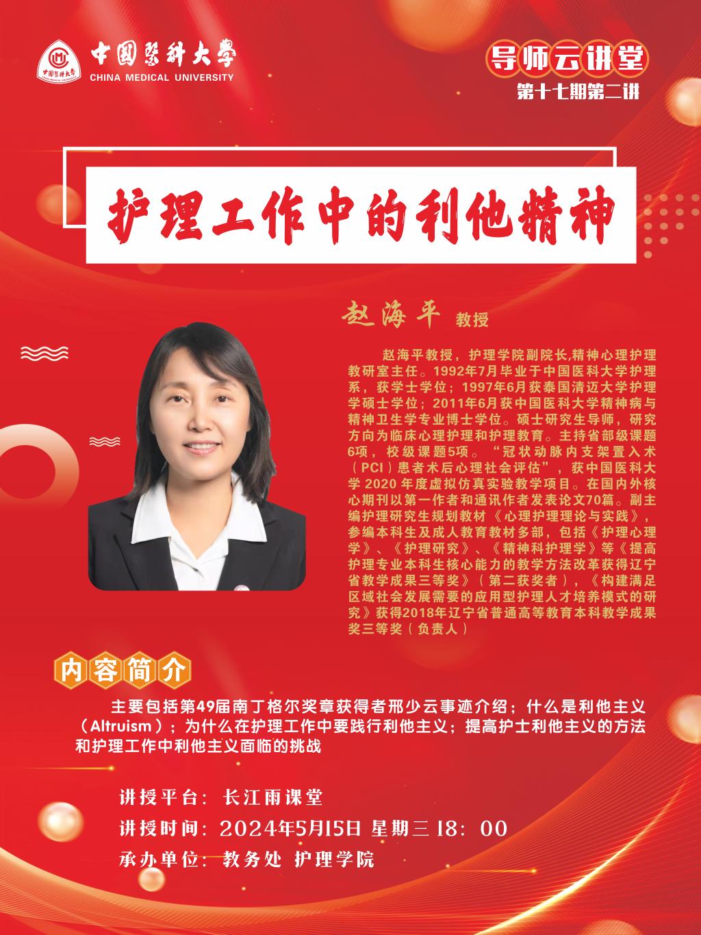 中国医科大学导师云讲堂第十七期第二讲活动由教务处联合护理学院举行。现将活动安排通知如下: