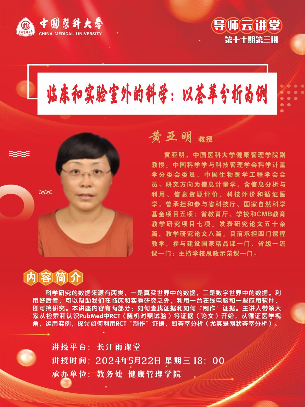 中国医科大学导师云讲堂第十七期第三讲活动由教务处联合健康管理学院举行。现将活动安排通知如下: