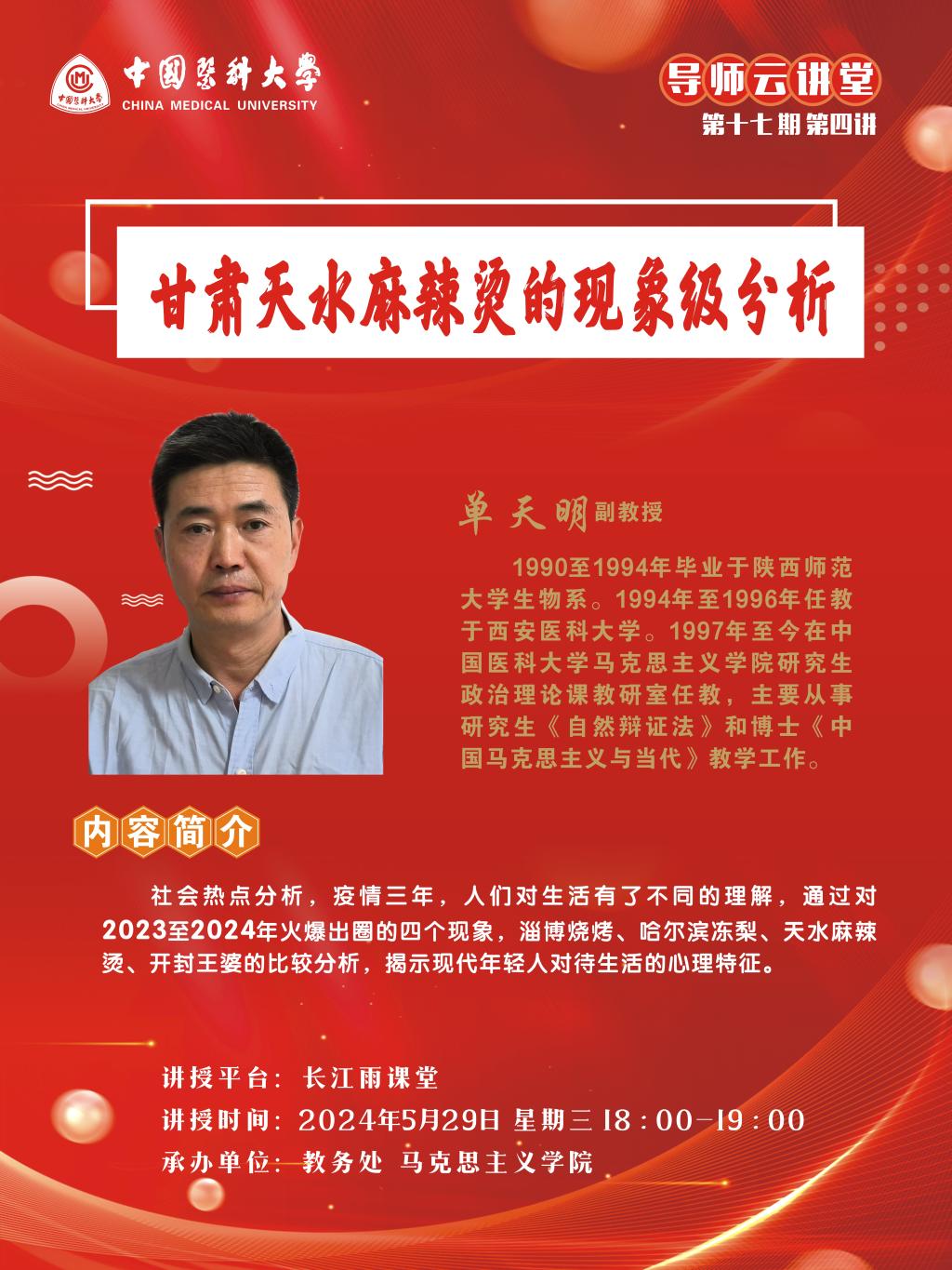 中国医科大学导师云讲堂第十七期第四讲活动由教务处联合马克思主义学院举行。现将活动安排通知如下: