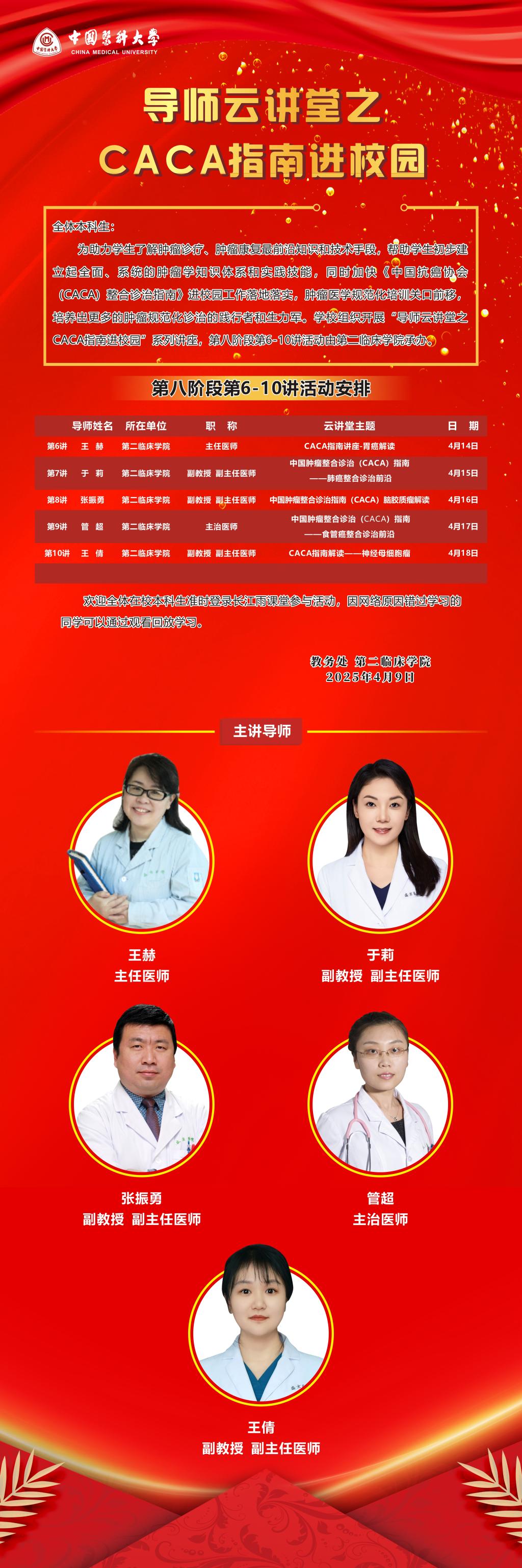 为助力学生了解肿瘤诊疗、肿瘤康复最前沿知识和技术手段,帮助学生初步建立起全面、系统的肿瘤学知识体系和实践技能,同时加快《中国抗癌协会(CACA)整合诊治指南》进校园工作落地落实,肿瘤医学规范化培训关口前移,培养出更多的肿瘤规范化诊治的践行者和生力军。学校组织开展“导师云讲堂之CACA指南进校园”系列讲座,第八阶段第6-10讲活动由第二临床学院承办。