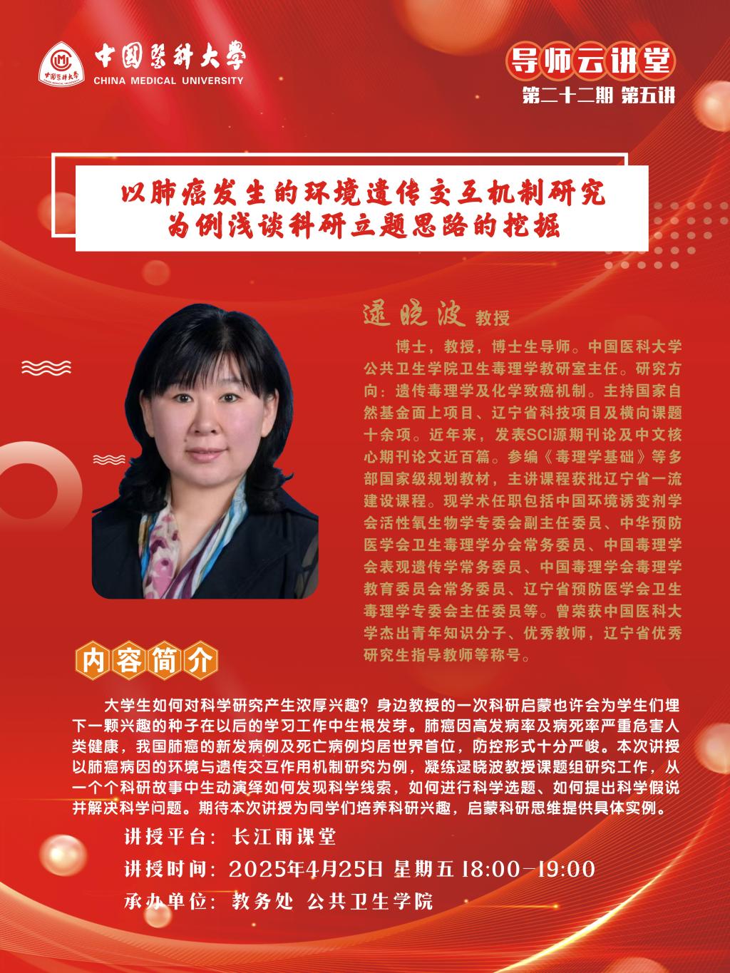 中国医科大学导师云讲堂第二十二期第五讲活动由教务处联合公共卫生学院举行。现将活动安排通知如下: