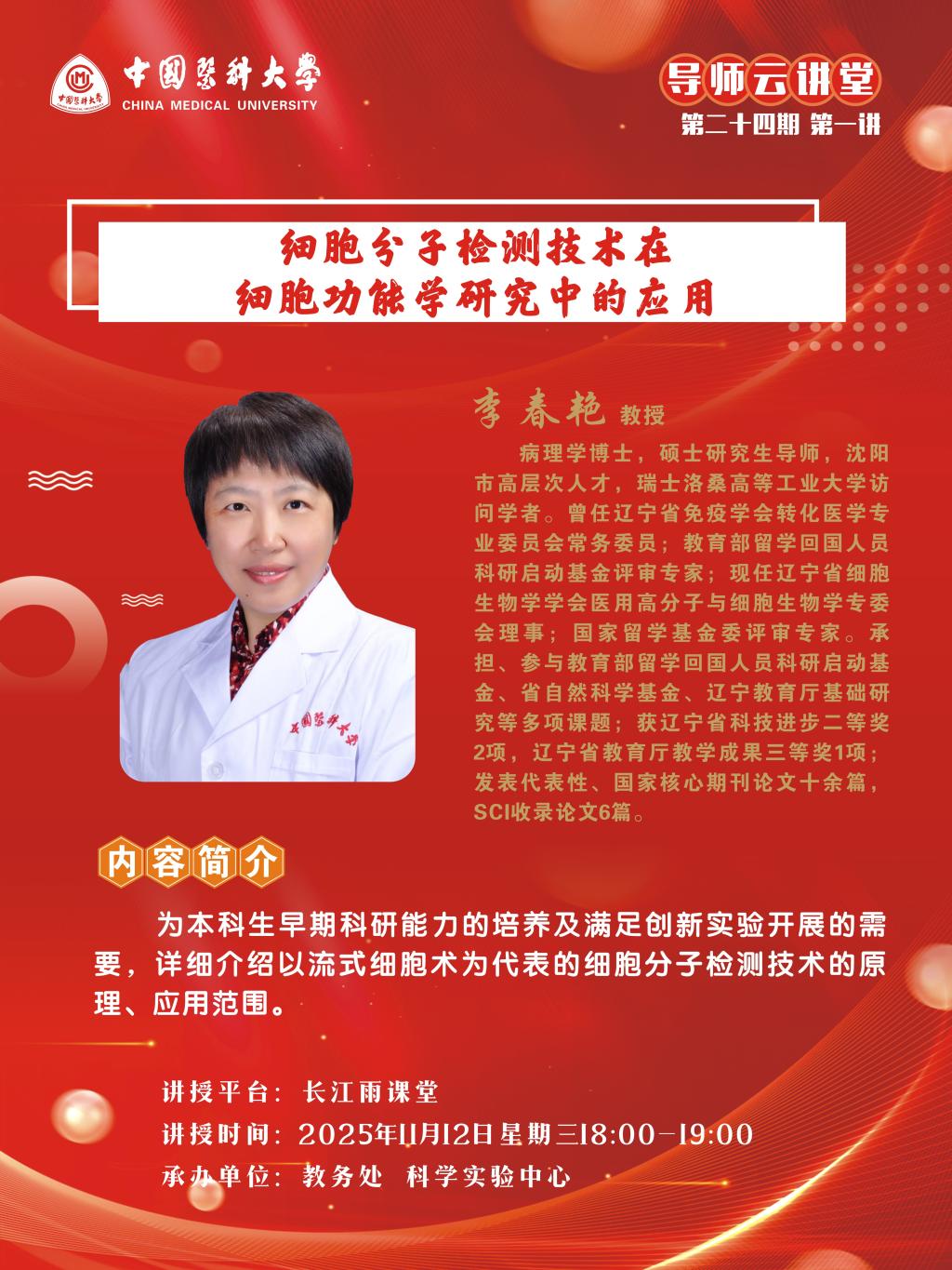 中国医科大学导师云讲堂第二十四期第一讲活动由教务处联合基础医学院举行。现将活动安排通知如下: