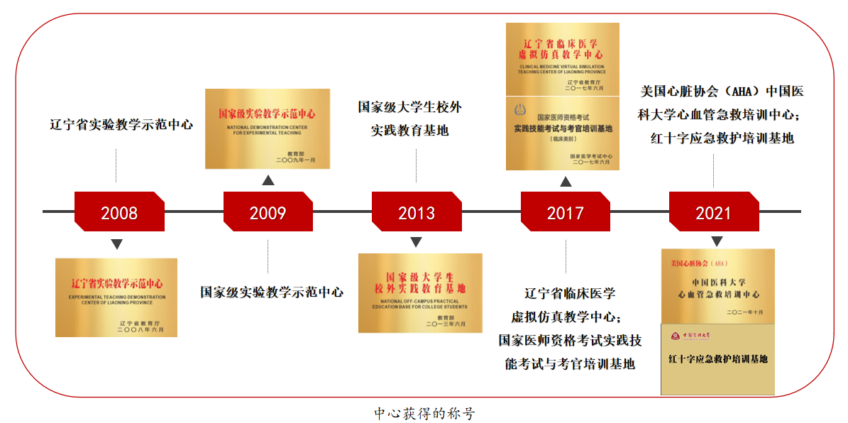 中心经过多年发展,先后获得多项荣誉称号。2013年被评为“国家级大学生校外实践教育基地”,2017年获评“国家医师资格考试实践技能考试基地及考官培训基地”,同年被评为“辽宁省临床医学虚拟仿真教学中心”等。