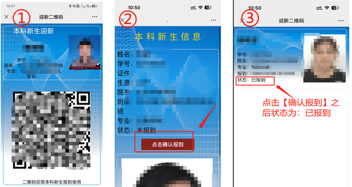 1、工作人员使用微信“扫一扫”功能扫描学生展示的迎新二维码。出现本科新生信息后,核对无误后点击确认报到。学生端页面的状态会更改为“已报到”(10秒左右页面自动刷新)。示例图如下: