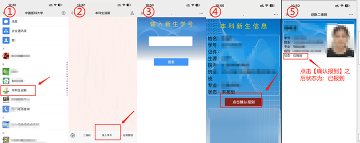 2、学生无法展示二维码时,工作人员通过录入学号的方式进行学生报到流程:【微信】-【通讯录】-【中国医科大学】-【本科生迎新】-【录入学号】-点击【搜索】-核对本科新生信息无误 -【点击确认报到】,学生端页面的状态会更改为“已报到”。示例图如下: