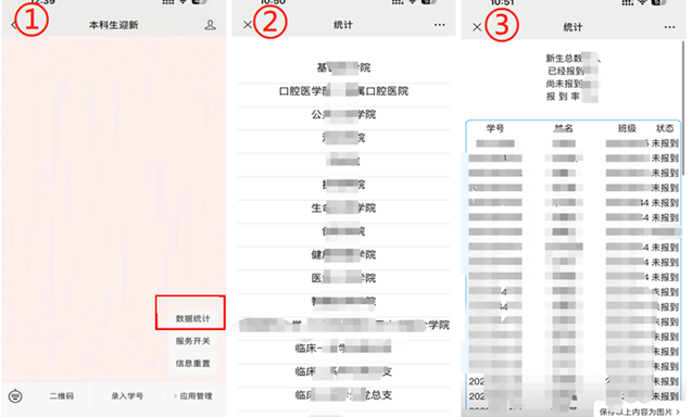 4、查看报到率:【本科生迎新】-【应用管理】-【数据统计】。点击自己学院可以看到统计信息,包括新生总数、已经报到人数、尚未报到人数、报到率。示例图如下: