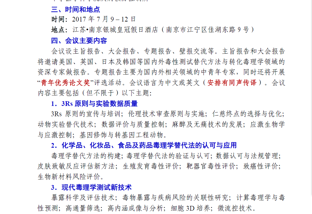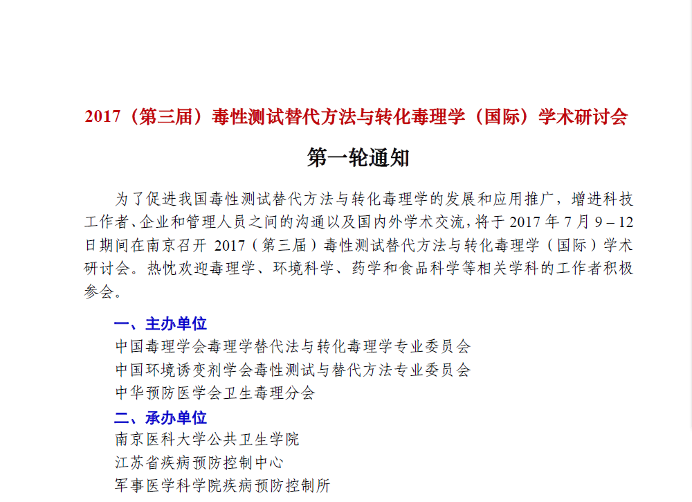 2017(第三届)毒性测试替代方法与转化毒理学(国际)学术研讨会第一轮通知