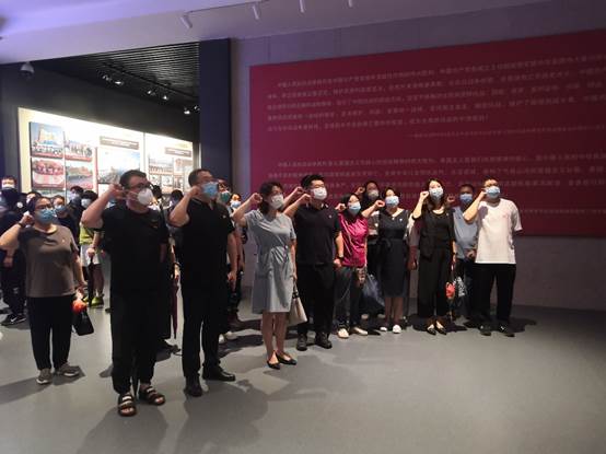 “我志愿加入中国共产党,拥护党的纲领……”。参观最后,支部党员在党旗下郑重举起右手,重温入党誓词。
