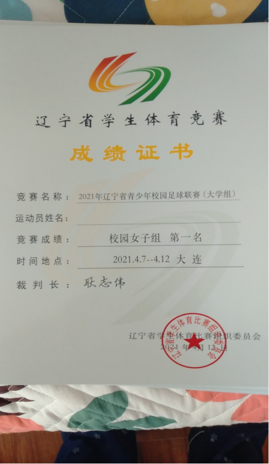2021年4月7日-12日在由辽宁省青少年校园足球工作领导小组办公室主办,辽宁省教育学院承办的“2021年辽宁省青少年校园足球联赛(大学组)比赛中,由张祎(第一临床学院)、林舒婷(第二临床学院)、毕露丹(第二临床学院)、陈婧(第二临床学院)、林俳羽(第四临床学院)、刘万俟(第四临床学院)、阿牛(第四临床学院)、张艺馨(公共卫生学院)、金福洋(护理学院)、段莹莹(护理学院)、石宇欣(护理学院)、吴书瑶(临床一系)、王露尧(临床一系)、张一端(临床一系)、邓天娇(临床一系)、朱心悦(临床一系)、蔡一(临床二系)、赖星月(临床二系)、刘天好(临床二系)、尹奕文(临床三系)20名同学组建我校女子足球代表队经过努力拼搏,5轮5胜共进11球,未失一球,提前一轮荣获冠军。同时获得2021年代表辽宁省参加全国校园足球联赛(大学校园组)决赛的比赛资格。