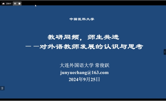 9月25日晚,中国医科大学外语教研部成功举办专题学术讲座,特邀大连外国语大学原副校长常俊跃教授聚焦外语教育教学改革做了题为《教研同频,师生共进—对外语教师发展的认识与思考》的精彩报告。外语教研部主任王奕萍教授主持,外语教研部全体教师参加了讲座。
