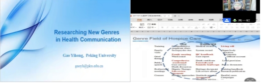 11月20日,北京大学外国语学院高一虹教授应外语教研部邀请,在腾讯会议线上做题为《健康交流中的新语类研究》的专题讲座。讲座由外语教研部王奕萍主任主持。辽宁大学外国语学院刘熠院长,盛京医院安宁病房王玉梅主任,外语教研部全体教师一起聆听了讲座。