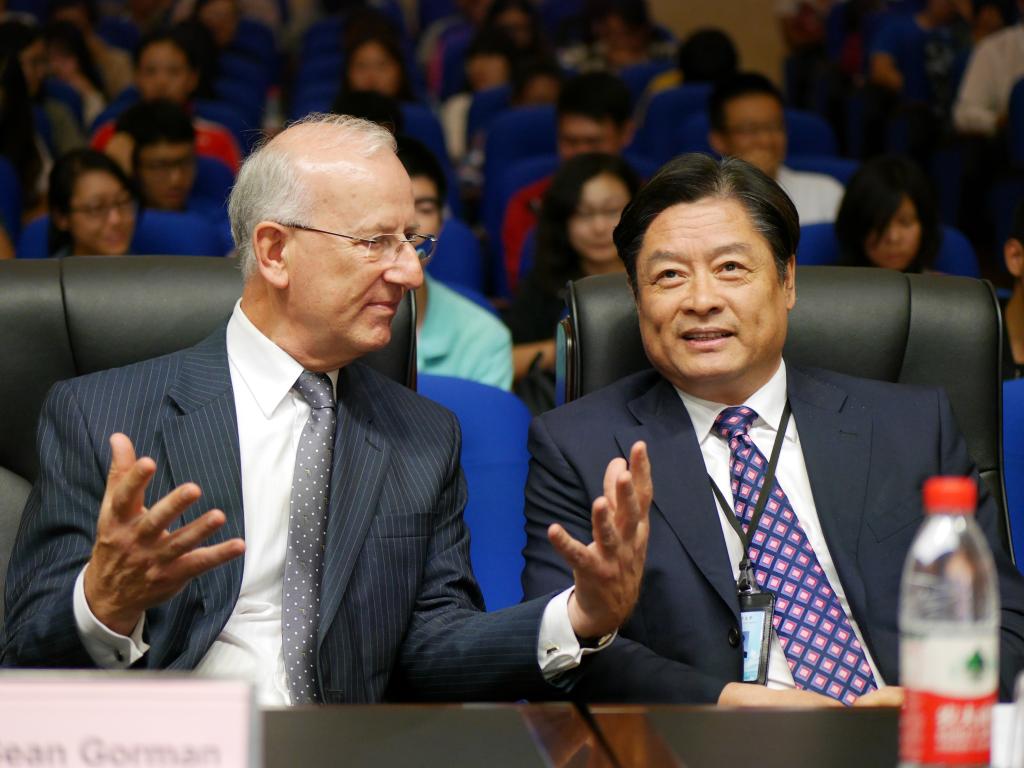 Sean Gorman教授此次来访的主要目的是向中英联合学院2014级注册女王大学课程学习的同学以及2015级新生同学表示祝贺与欢迎,并带来了女王大学校长Patrick Johnston教授的良好祝愿。在欢迎视频中,Patrick Johnston教授表达了对与我校合作办学的肯定,以及对未来两校合作发展的信心。赵群校长在随后的致辞中,对中英联合学院学生们未来的发展提出了殷切期望,并表示要将中英联合学院打造成国际合作办学模式的典范。
