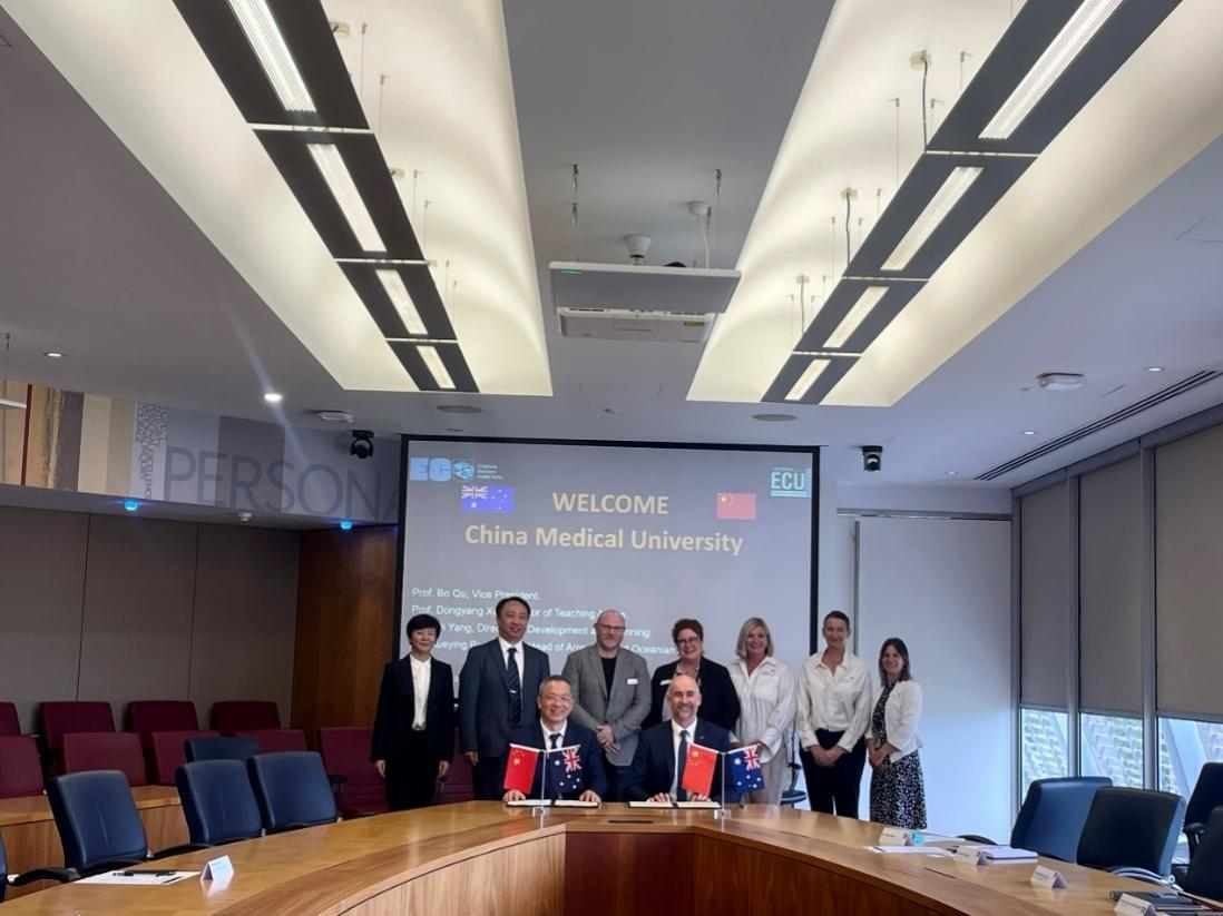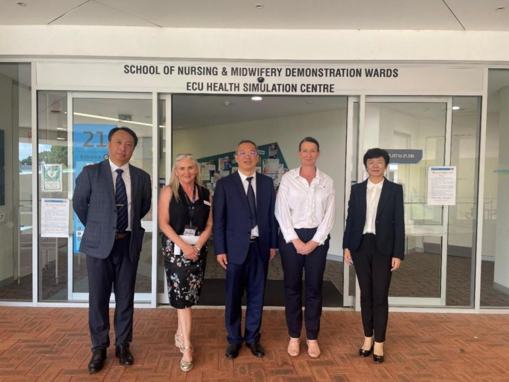 在伊迪斯科文大学(Edith Cowan University),代表团会见了副校长Jake Garman先生、医学与生命科学学院副院长Simon Laws教授、护理及助产学院行政院长Karen Strickland教授及其团队等重要人员。会上双方成功签署了《中国医科大学-伊迪斯科文大学谅解备忘录》,并对协议框架下的学生短期交流、双学位项目及教师发展机会进行了积极协商并表达了合作意愿。代表团还参观了护理及助产学院,对其招生规模量、培养模式、教学方法等方面行了深入交流。
