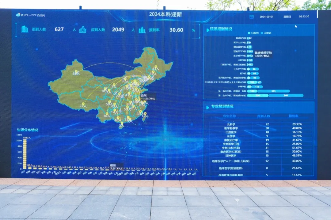 在迎新现场,新生报到智慧大屏吸引了广大新生和家长的关注,可视化展现总体报到人数、各院系报到人数以及生源分析和男女报到比例等数据,既高效便捷又充满人文关怀。