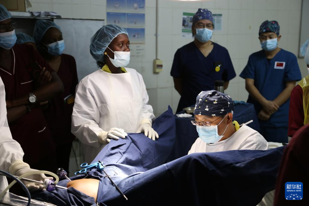 3月12日,在位于冈比亚首都班珠尔的爱德华·弗朗西斯·斯莫教学医院手术室,第22批援冈医疗队队长蔡贵阳(前右)为一名患者实施腹腔镜手术。