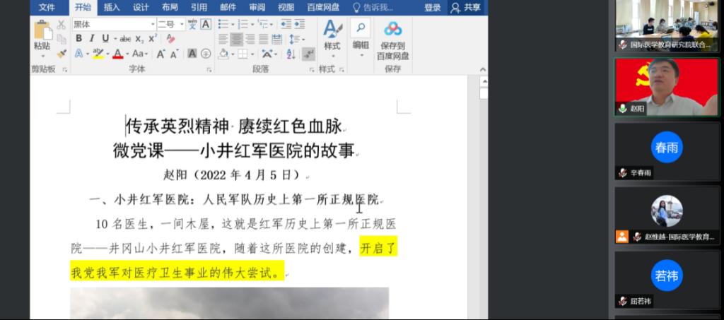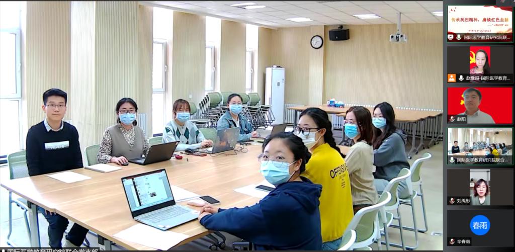 清明时节,折菊以寄缅怀之情。正值疫情防控工作的关键阶段。为深入传承弘扬英烈事迹和精神,缅怀革命先烈的丰功伟绩,在师生群体中营造学习、缅怀、致敬英烈的良好风尚。2022年4月5日,国际医学教育研究院组织全体研究生及部分教师开展以“传承英烈精神 赓续红色血脉”为主题的“云端祭英烈”活动。