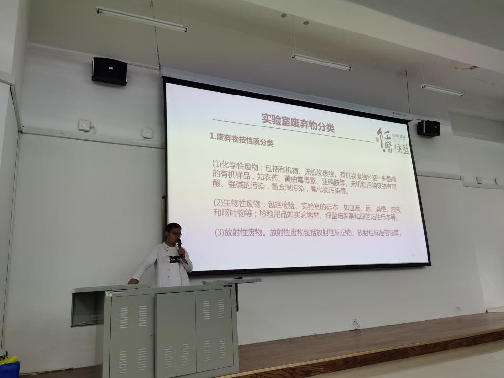 本次培训邀请资产管理处科长高久强和吕金鑫老师作为主讲嘉宾。培训会上,高久强介绍开展实验室安全教育培训的重要意义,特别强调实验室安全操作和实验废弃物科学规范处理的重要性。他从典型案例分析入手,全面地讲解了实验室安全生产的规范性要求和具体措施。吕金鑫老师利用现场示范以及生动的动画视频,系统地讲解了实验室废弃物分类、处理流程和处理原则等内容。