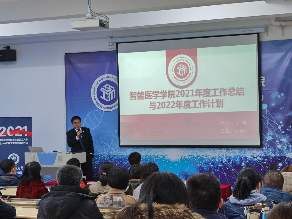 大会在庄严的国歌声中隆重开幕,院长沙宪政向大会作工作报告。报告总结了学院一年来的工作成绩,分析了存在的问题以及面临的机遇和挑战,并对2022年学院工作进行了动员部署,希望智能医学学院上下坚守育人初心、不负红医使命,再接再厉,取得更加辉煌的业绩。