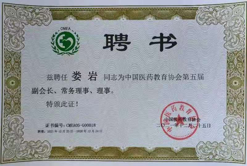 2021年12月25日,在换届选举产生的新一届领导集体中,我院娄岩教授当选为中国医药教育协会第五届副会长、常务理事、理事。