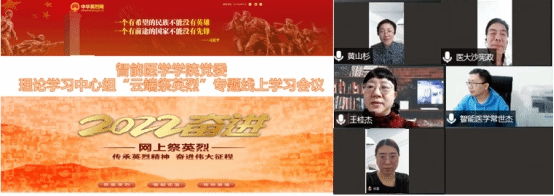 “云端祭英烈”活动后,黄山杉同志领学习近平总书记关于英雄的重要论述,从“一个有希望的民族不能没有英雄”、 “和平年代同样需要英雄情怀”、“英雄是民族最闪亮的坐标”、“新时代是成就英雄的时代”、“把革命先烈流血牺牲打下的红色江山守护好、建设好”等金句切入,结合工作实际阐述了英雄精神的内涵。她强调,在时代的变迁中,英雄精神始终彰显着永恒的价值。在新时代,以国之名向烈士致以深深的悼念,是对光辉历史的铭记、对英烈的怀念和崇敬,也是对我们在砥砺前行中强有力的鼓舞、鞭策和激励。她要求,新征程上要时刻牢记习近平总书记的重要指示批示精神,肩负红医人的时代使命,把革命先烈精神内化于心、外化于行,踔厉奋发,笃行不怠,在平凡的岗位上奋斗出不平凡的事业。中心组成员各抒己见,纷纷表达了自己的所感所悟:有感恩,感恩先烈们付出自己的鲜血乃至生命换来我们今天的幸福生活;有激励,激励我们学习英雄精神和正义品质勇往直前;更多的是鞭策,鞭策我们在珍惜这来之不易生活的同时,接续为推动高等教育事业、推进学校高质量发展作出新的贡献。