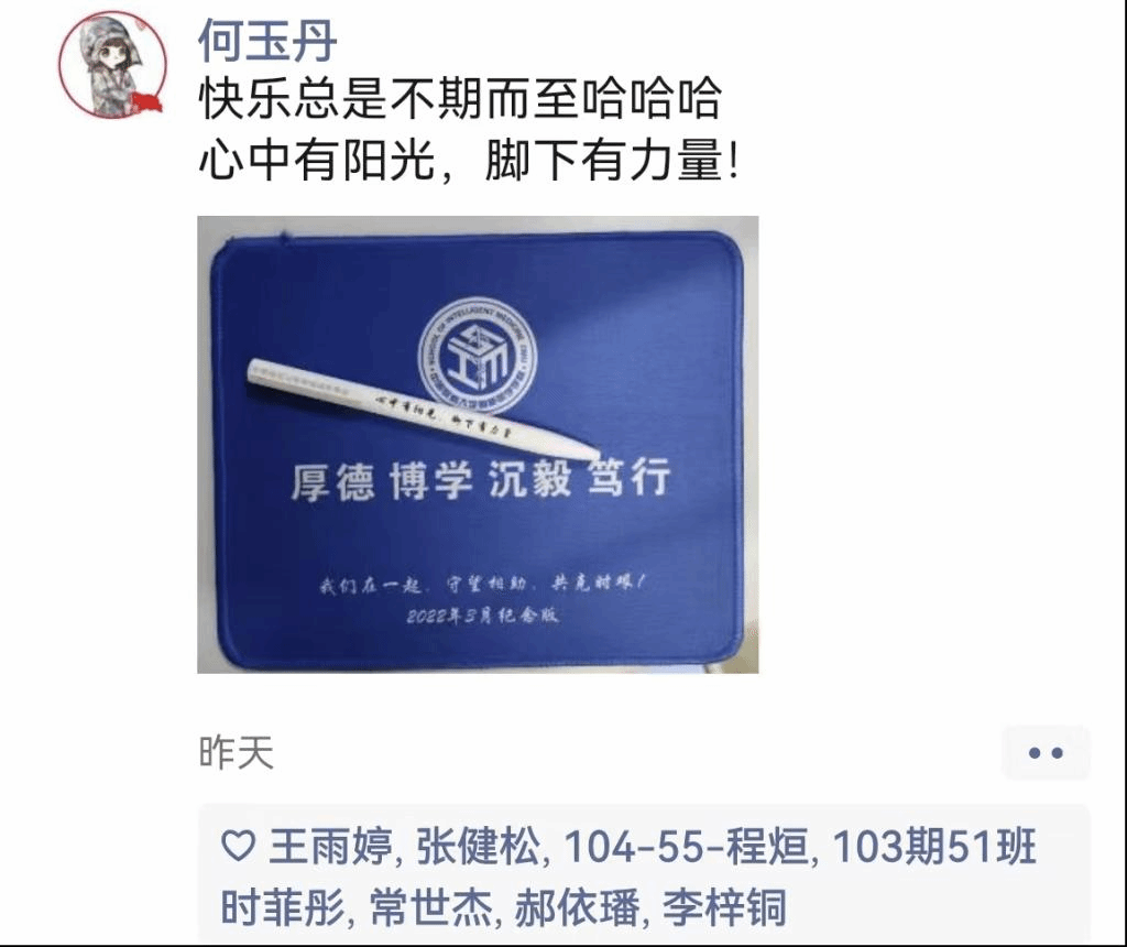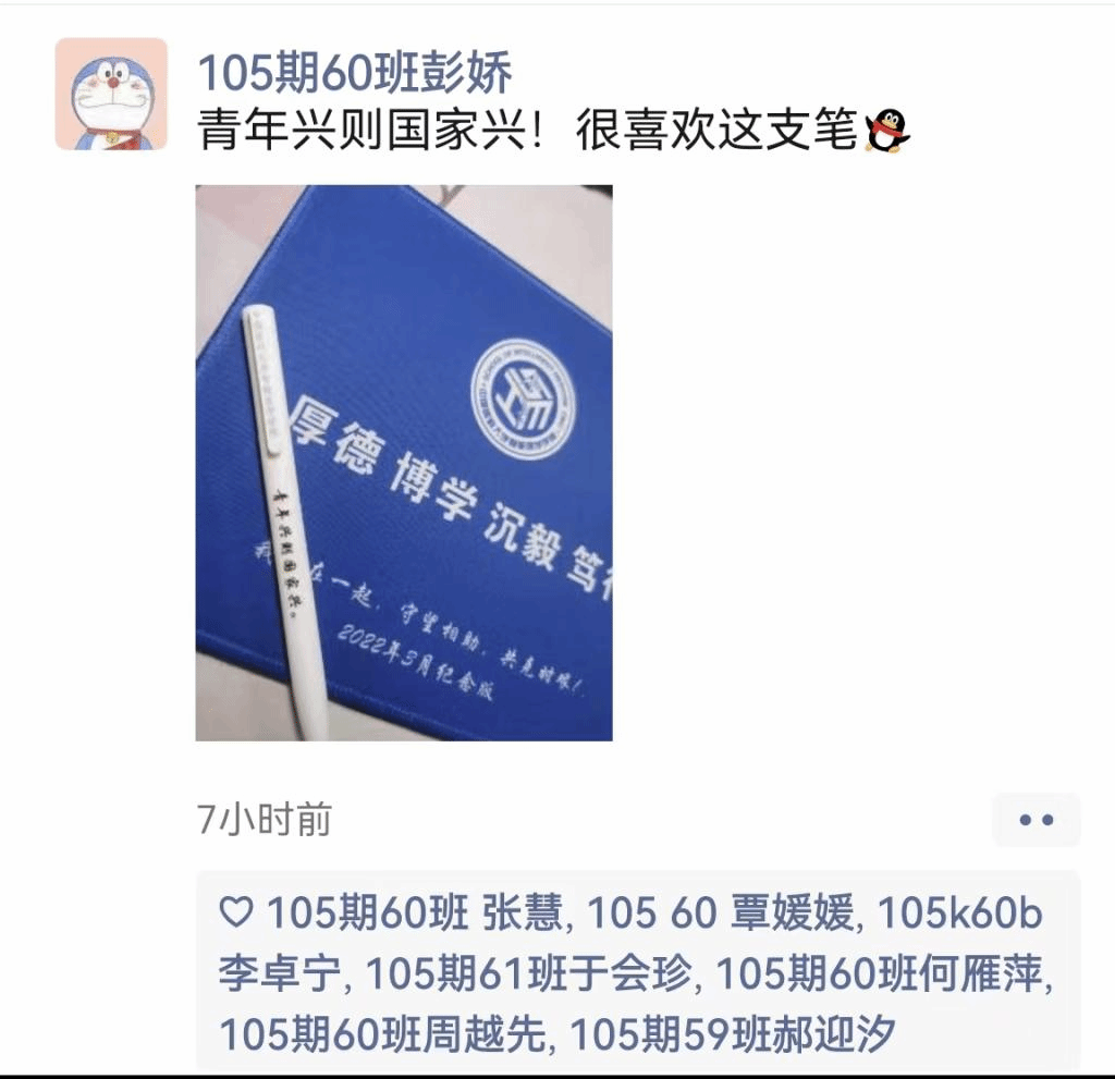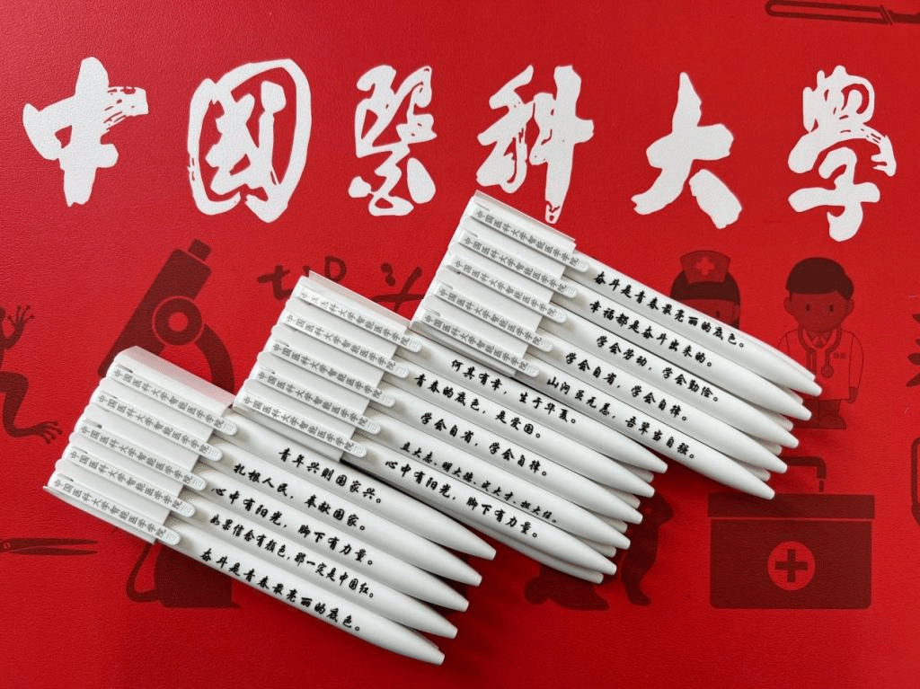 本学期初,学院学生科、团委整理习近平总书记对青年的寄语并汇总成册,后期添加部分关于理想信念、青春奋斗、自律自省等方面的名言警句,如“心中有阳光 脚下有力量”“扎根人民 奉献国家”“奋斗是青春最靓丽的底色”“如果信念有颜色 那一定是中国红”“山河虽无恙 吾辈当自强”“学会感恩 学会助人”“学会劳动 学会勤俭”等,最终从中精选15条刻印于学院定制笔上,让一支支普普通通的文具笔拥有了传递价值的力量。