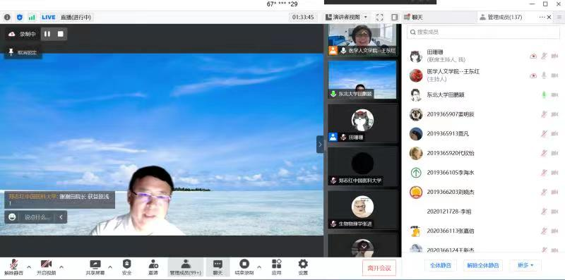 会议邀请东北大学马克思主义学院院长田鹏颖教授作为主讲嘉宾,他紧紧围绕“当代中国马克思主义在 21 世纪的文明境界”这一主题,深刻分析阐释了“习近平新时代中国特色社会主义思想是当代中国马克思主义、二十一世纪马克思主义,是中华文化和中国精神的时代精华,实现了马克思主义中国化新的飞跃”这一重大论断,具体表现为“四个文明转向”:当代中国马克思主义,实现了科学社会主义在“从一般向特殊转化”基础上,再 “从特殊向一般跃升”的文明转向;实现了中华优秀传统文化从传统向现代创造性转化和创新性发展的文明转向;实现了现代世界两种意识形态、两种社会文明在博弈中有利于社会主义的文明转向;实现了人类社会从“普世价值”试图绑架人类价值追求,向以构建人类命运共同体为宗旨的“全人类共同价值”的文明转向。在线聆听的师生从田教授生动而又深刻的讲解中深受启发、受益匪浅,也被他的专业功力与讲授风格深深折服。